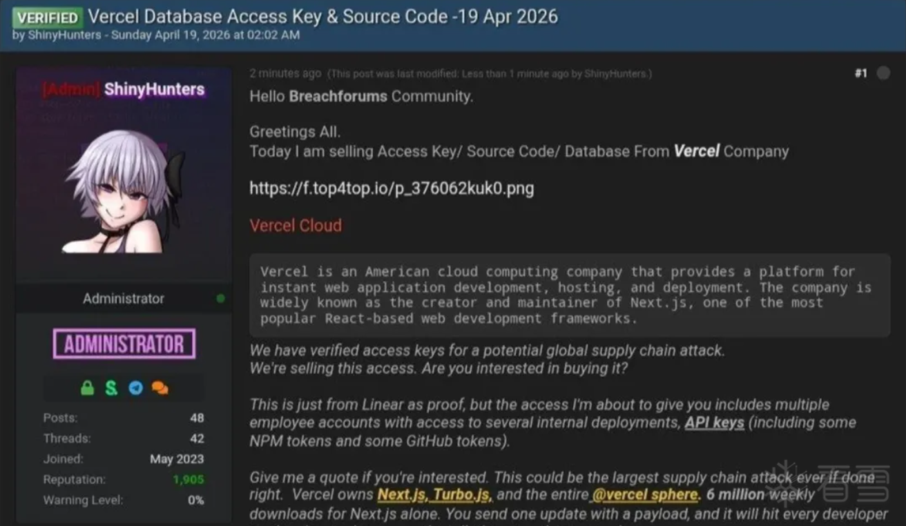 资讯来源:本文内容综合编译自 BleepingComputer 报道《Vercel confirms breach as hackers claim to be selling stolen data》及 Vercel 官方安全公告