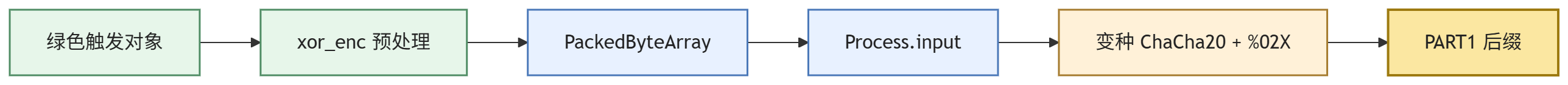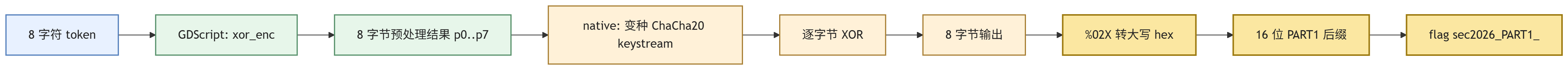 经过前述动态验证,PART1 的 flag 生成逻辑已经可以用一条稳定链条描述:先读取屏幕左上角的 8 字符 token;在 GDScript 里调用 xor_enc,把它变成 8 字节的预处理结果;再把这 8 字节送入 native 层的 Process.input 核心;native 使用一套“ChaCha20 轮函数不变、常量被魔改”的流密码生成 keystream,并与输入逐字节 XOR;最后把得到的 8 个输出字节用 %02X 转成 16 个大写十六进制字符,再拼接进 flag{sec2026_PART1_<HEX16>}。
