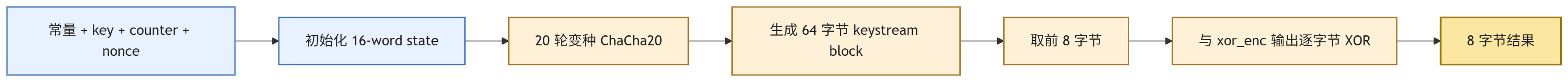 虽然本题只处理 8 字节输入,实际只会用到首个 64 字节 keystream block 的前 8 个字节,但从实现角度仍然应该完整生成整个 block,再截取前 8 个字节参与 XOR。