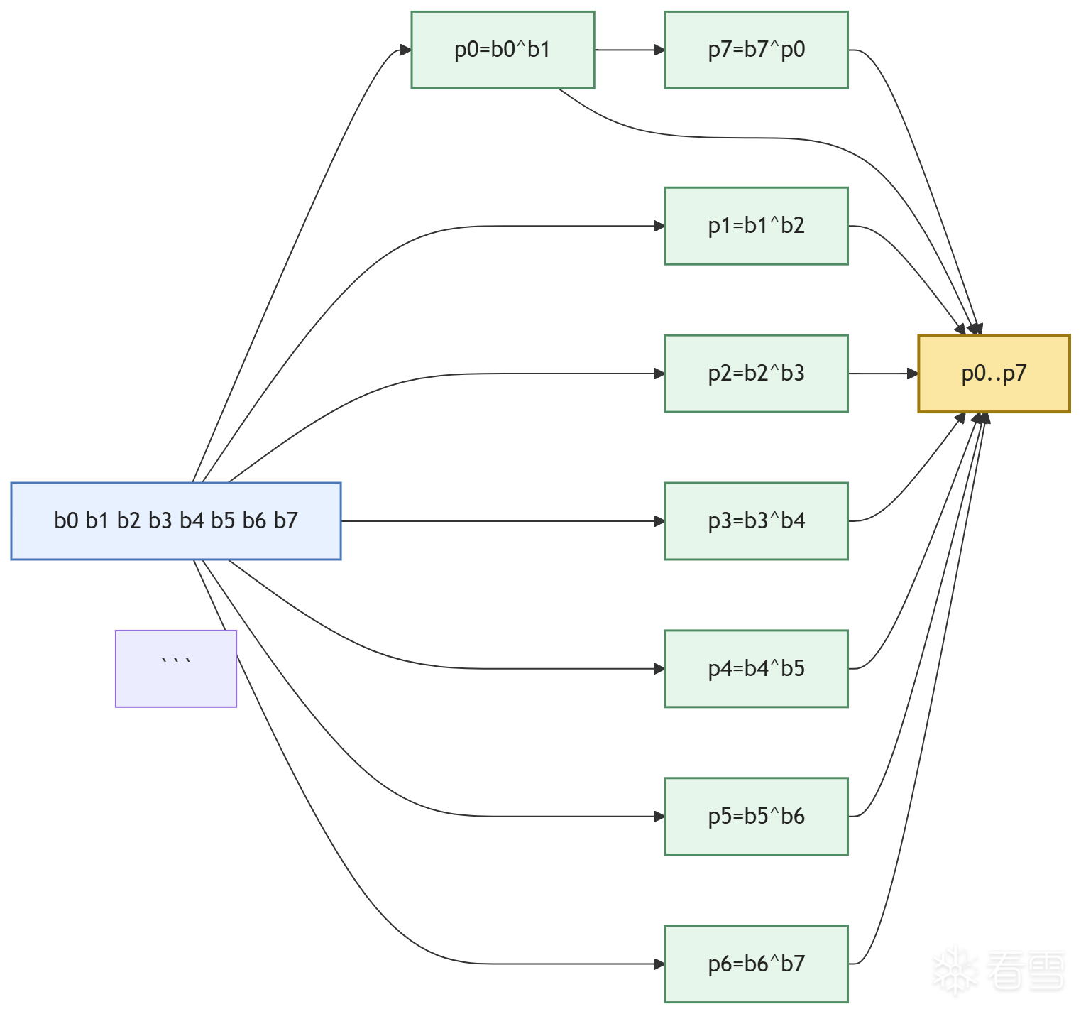 设 token 的 8 个 ASCII 字节为 b0 b1 b2 b3 b4 b5 b6 b7,则 xor_enc 输出的 8 字节 p0..p7 满足下式: