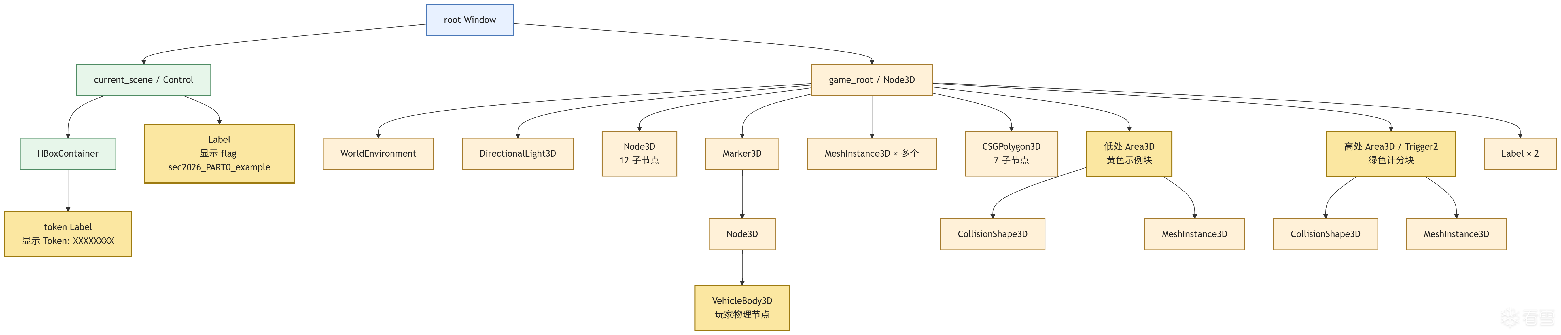 这一轮不是停留在“理论上可行”,而是实际打通了 Engine -> SceneTree -> root/current_scene。继续向下枚举后,很快发现 current_scene 其实只是 UI 容器,它下面只有两个孩子,显示的正是 Token: ca567fe5 和 flag{sec2026_PART0_example};真正的 3D 游戏场景并不在这里,而在 root.child[1] 那棵 Node3D 子树下。这个发现非常关键,因为它解释了为什么一开始盯着 current_scene 总像是在看“对的场景却没有对的对象”。