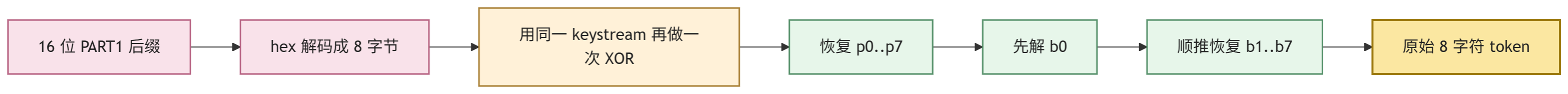 真正需要推导的是如何从 p0..p7 还原 b0..b7。因为 xor_enc 的结构是链式关系,所以可以先解出 b0,再顺推整个 token。推导后的恢复公式如下: