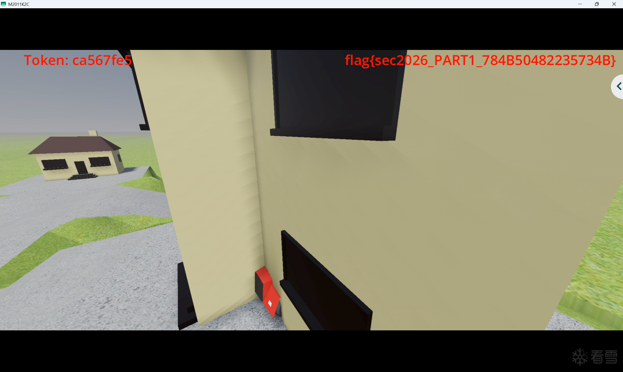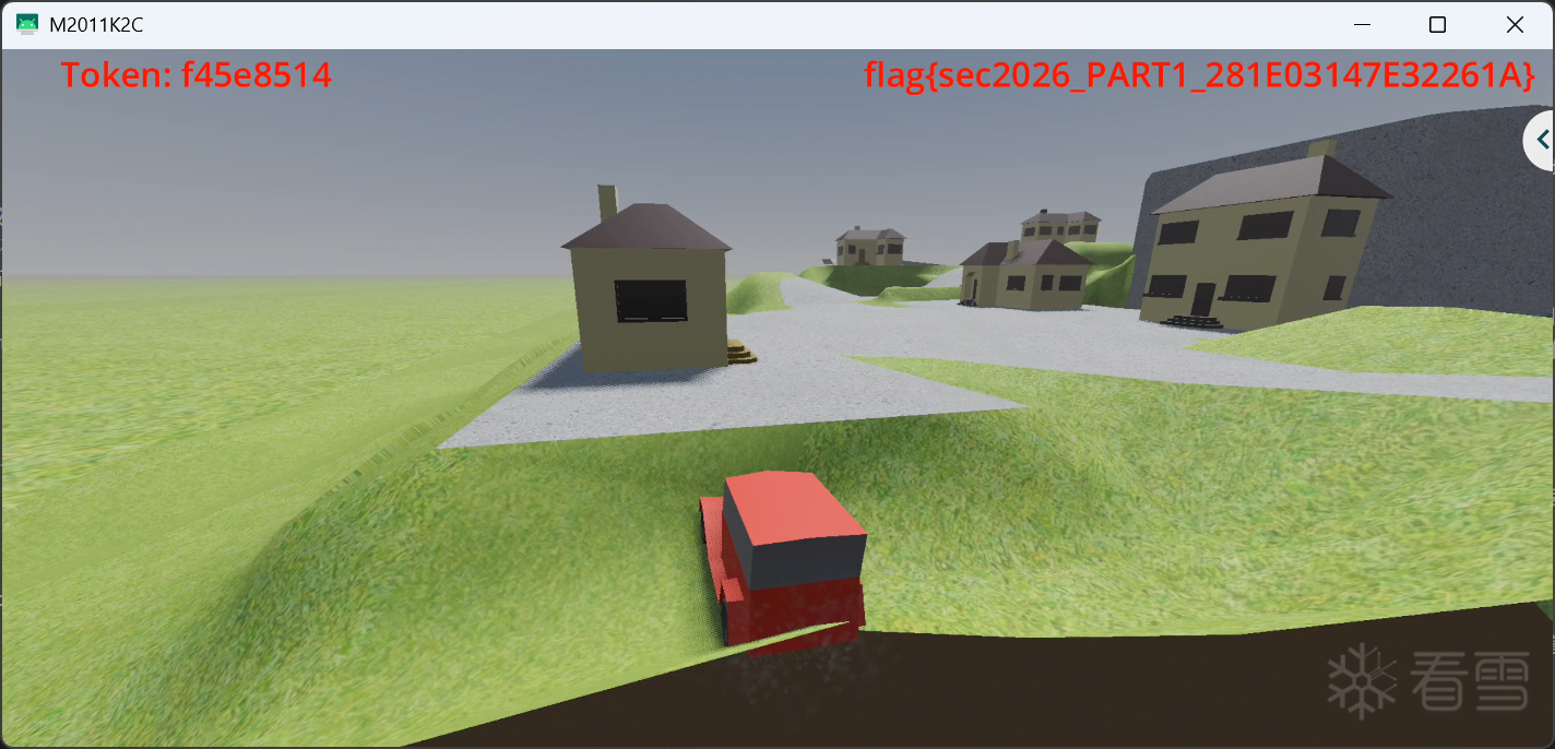 同步读回的位置表明写位是稳定生效的,位置持续命中高处 Area3D 附近。随后在真机上肉眼观察到首次真实高处分支结果,截图显示左上角 token 为 ca567fe5,右上角结果为 flag{sec2026_PART1_784B50482235734B}。