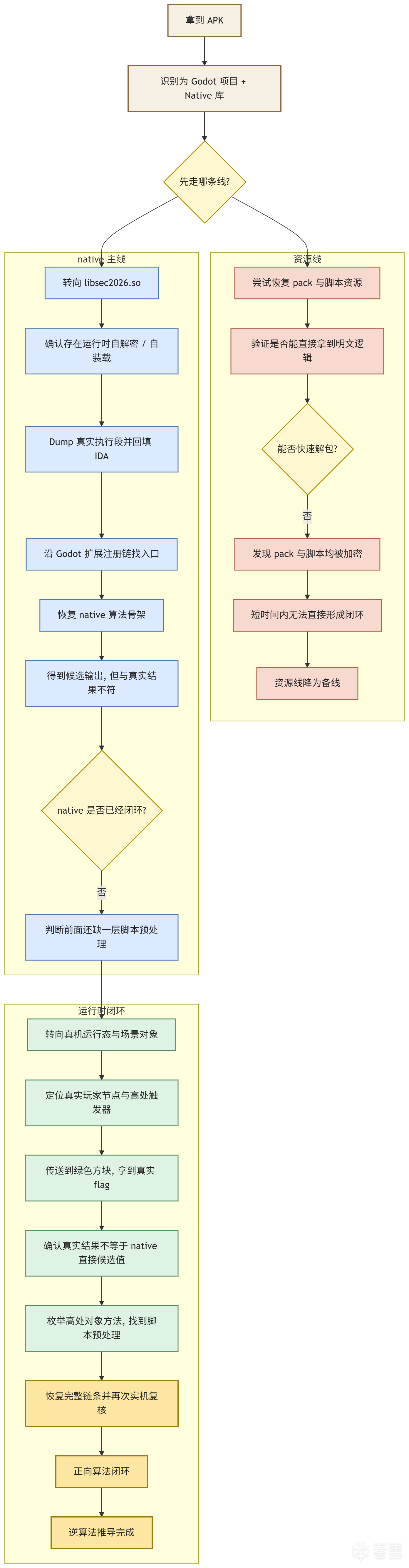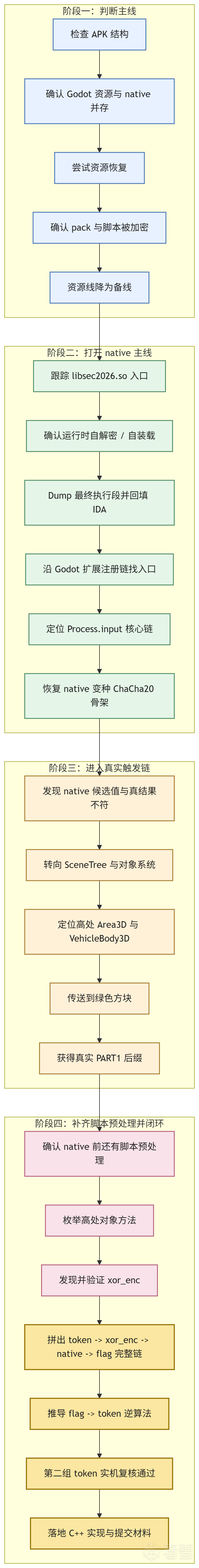 这层防护最有效的地方,在于它不是为了彻底阻止后续恢复,而是为了打乱分析顺序。理论上讲,只要拿到正确 key,后续还是能回到脚本层;但在比赛语境下,只要它能让分析者在前期无法把脚本线直接打穿,native 线就会被迫上升为主线。