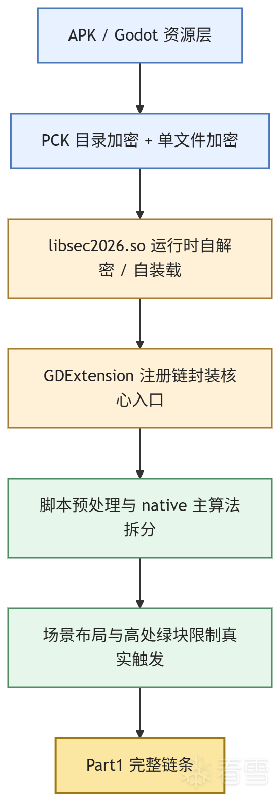 第二层安全机制在资源侧。assets.sparsepck 的目录本身经过加密,导致常规 Godot 恢复工具在最开始就无法正常枚举资源树。更进一步,token.gdc、Trigger/trigger.gdc、label2.gdc、sec2026.gdextension 又不是普通明文文件,而是带有 Godot FileAccessEncrypted 风格包装。这样一来,资源线不是单点被卡,而是同时被“目录不可枚举”和“单文件不可直接反编”双重阻断。