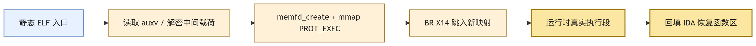 因此,“为什么判断它是运行时自解密”并不是只靠某一个现象,而是由三组证据共同支撑的:原始 IDA 视图中极不自然的函数分布;入口路径上明确出现的 memfd_create、mmap(PROT_EXEC) 与 BR X14;以及顺着这条路径实际 dump 出来的新 r-x 映射和回填后恢复出的函数区。三组证据首尾相扣,所以可以较强地判断这不是普通混淆,而是明确的运行时自解密 / 自装载过程。