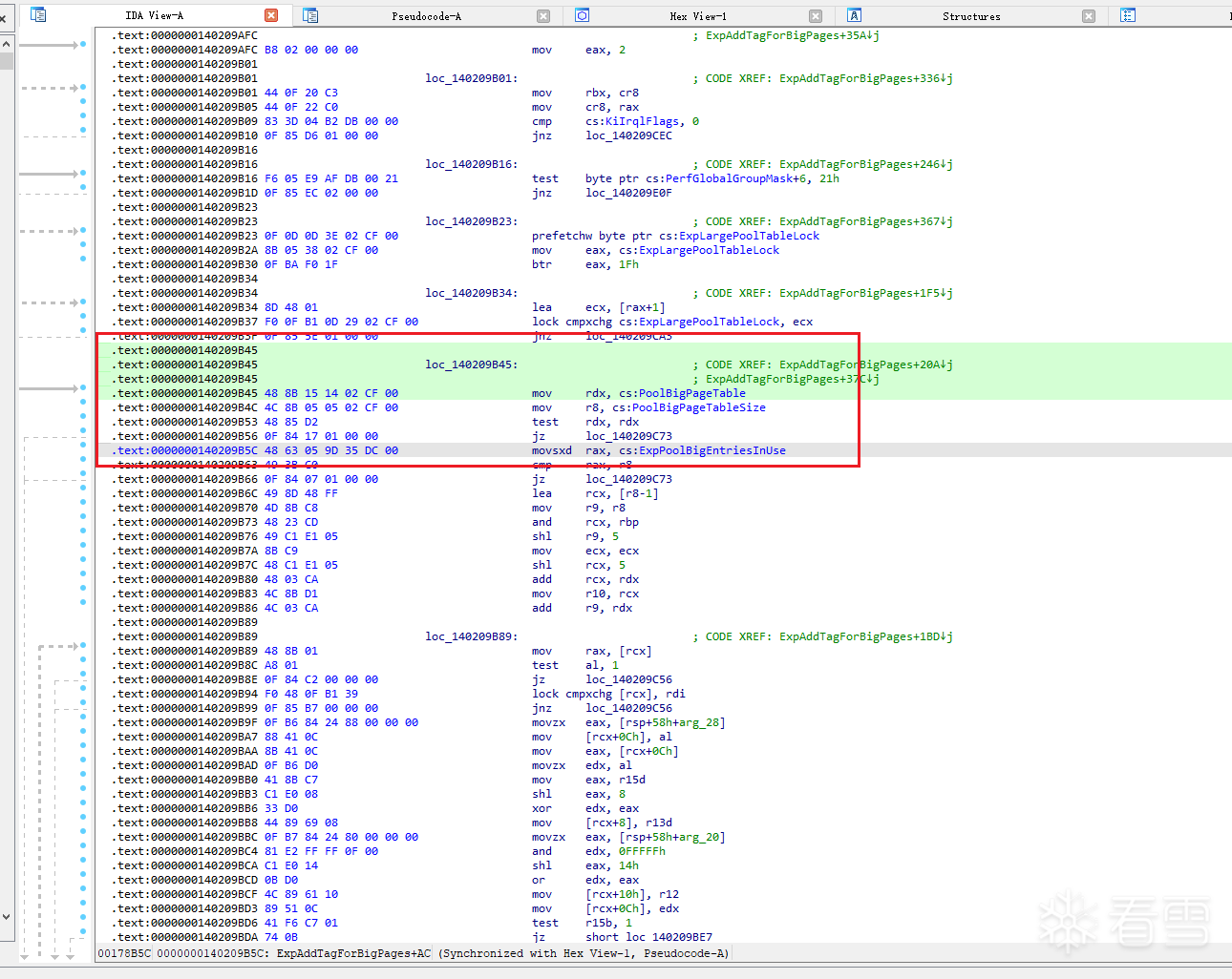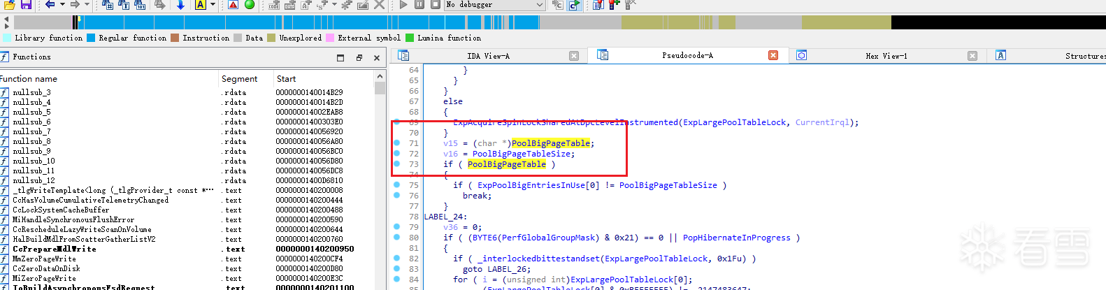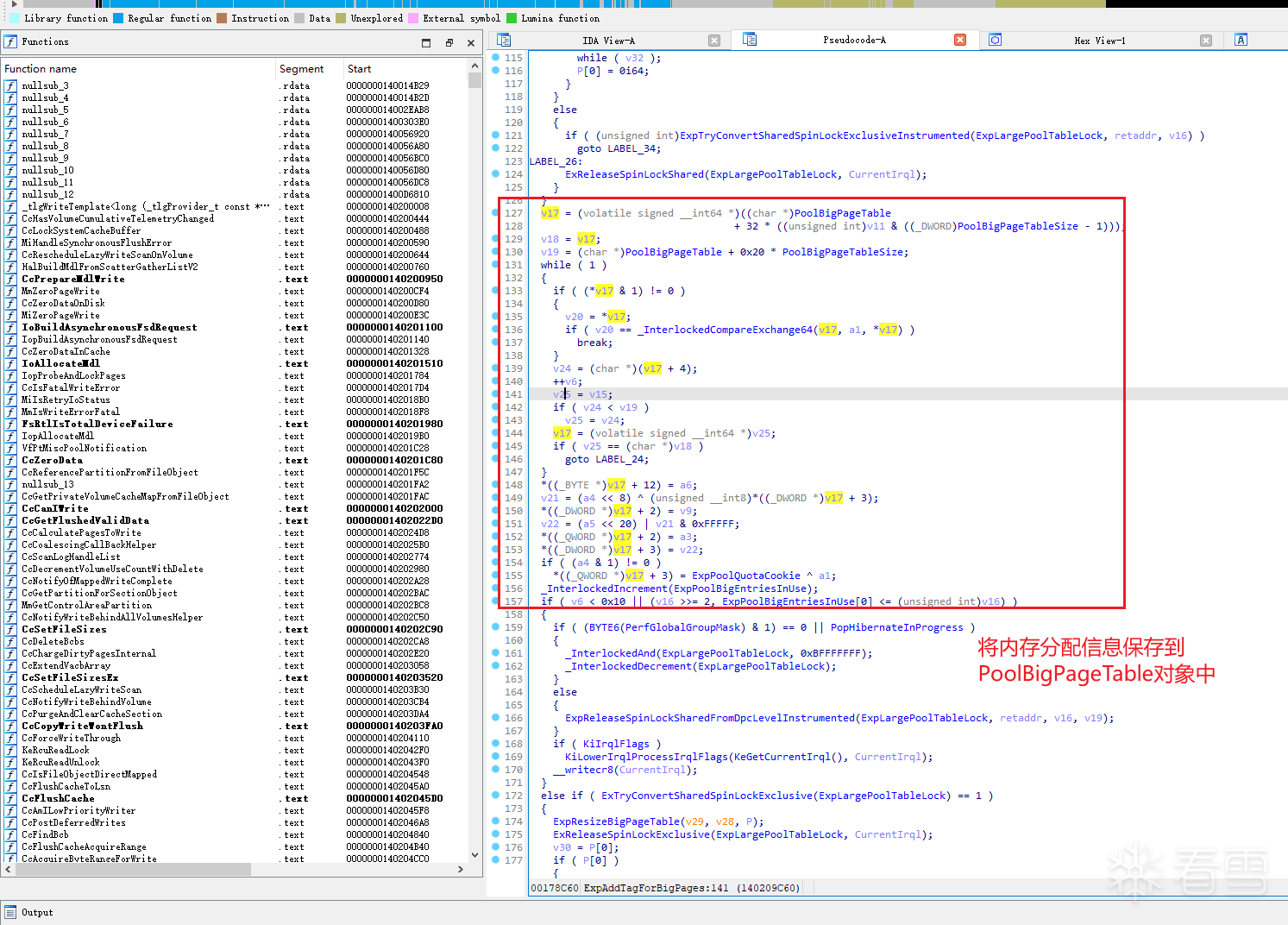 经过笔者分析发现,内核中大部分常用的内存分配函数,最终都会将分配到的内存信息保存到PoolBigPageTable对象中,所以利用该系统特性,我们就可以遍历PoolBigPageTable中所有的条目,找出敏感的匿名内存分配行为。