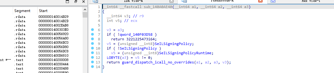 笔者首先关注到的函数为 sub_140A0AE40,从反编译结果来看,这个函数本身的逻辑非常简单:先检查一个全局函数指针是否为空,随后读取 SeILSigningPolicy / SeILSigningPolicyRuntime 相关状态,整理出一个布尔值,最后通过 guard_dispatch_icall_no_overrides 发起一次受CFG保护的间接调用。