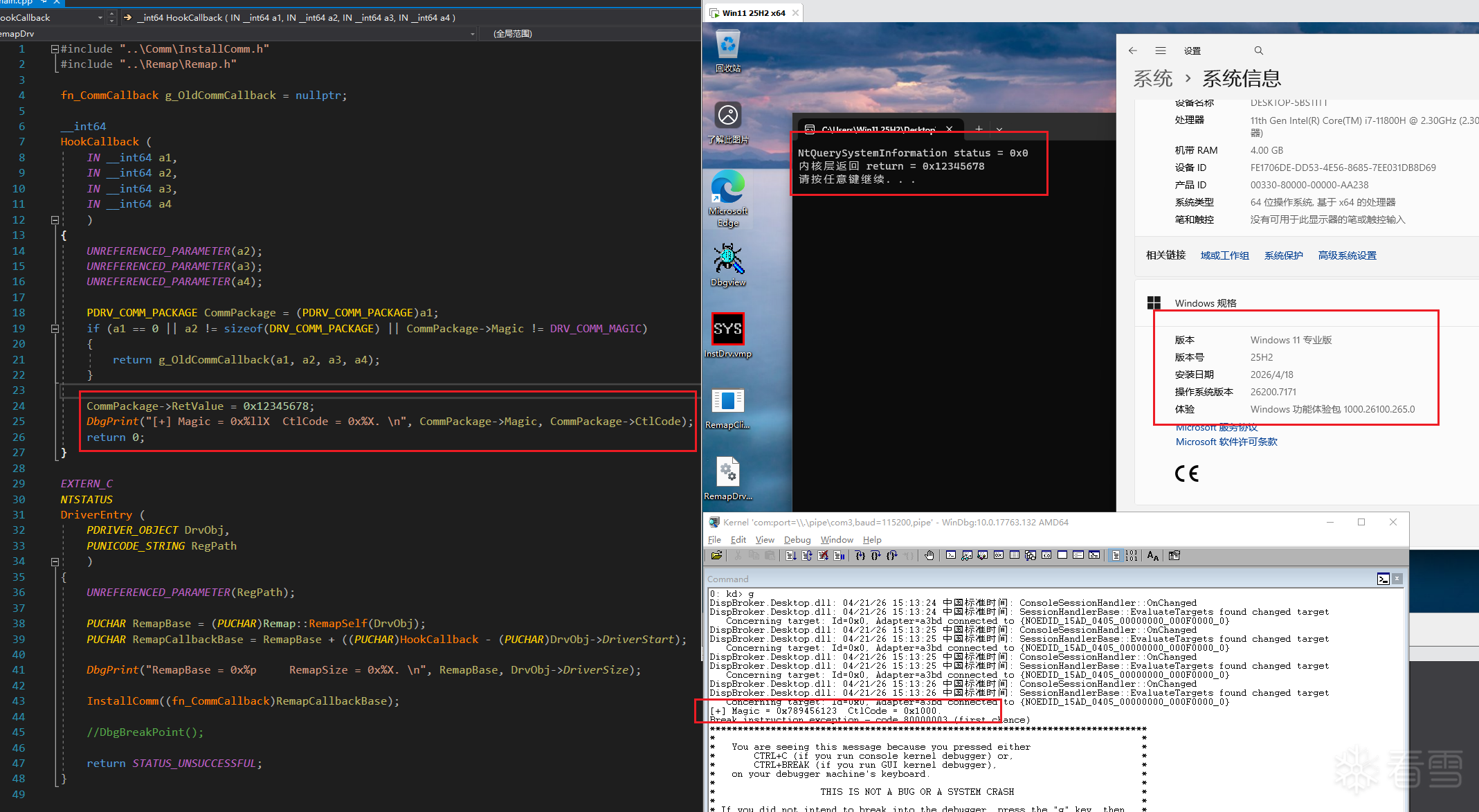 关于PG(PatchGuard)问题:有别于修改SSDT、IDT表项本身,这里真正劫持、改写的是某条系统调用内部会间接访问的函数指针或回调槽位,笔者测试时最长40h内无任何蓝屏状况。