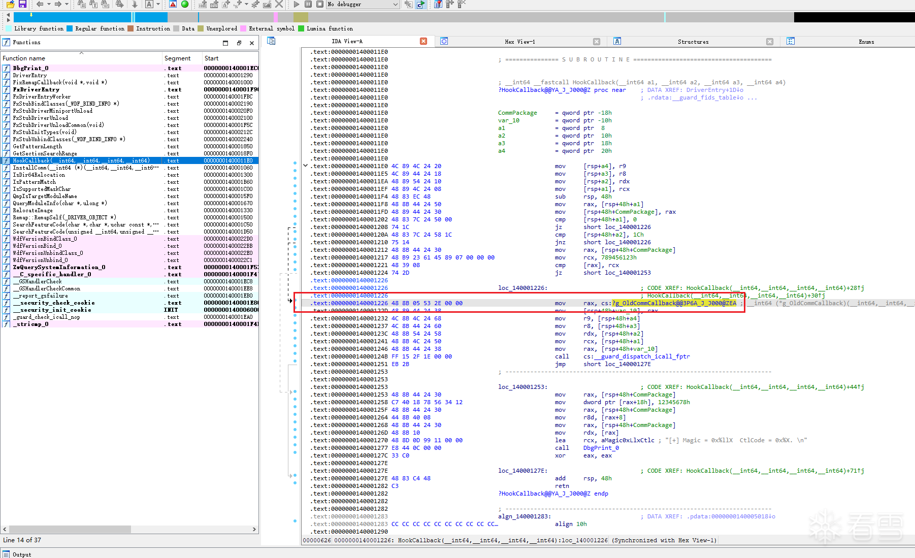 使用IDA反汇编我们的靶场驱动,其中的HookCallback函数需要修复的地方,如图所示: