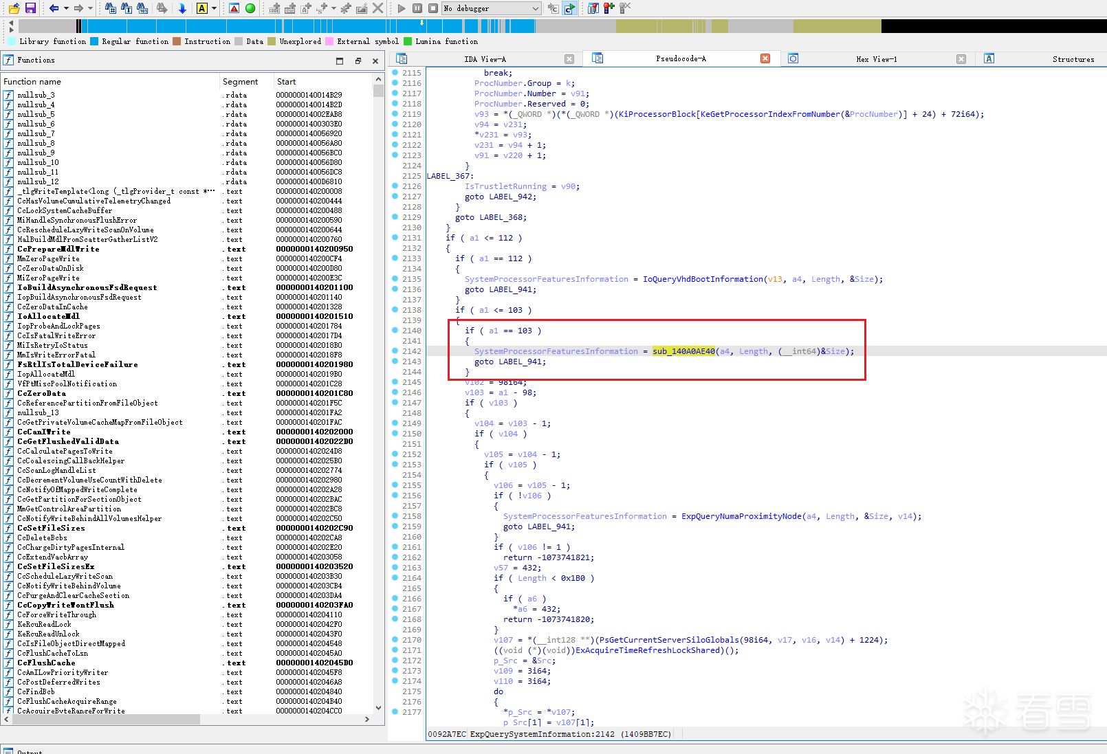 接下来继续查看 sub_140A0AE40 的交叉引用,可以发现它并不是一个孤立存在的内部函数,而是由 ExpQuerySystemInformation 在特定分支中调用。当 SystemInformationClass == 103 时,ExpQuerySystemInformation 会执行如下逻辑,如图2-4-2所示