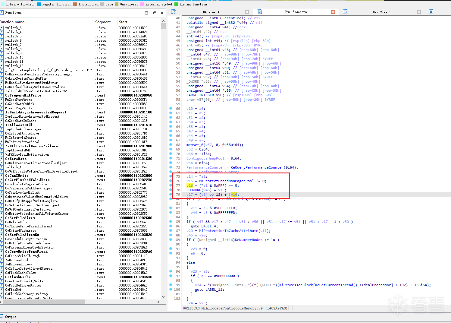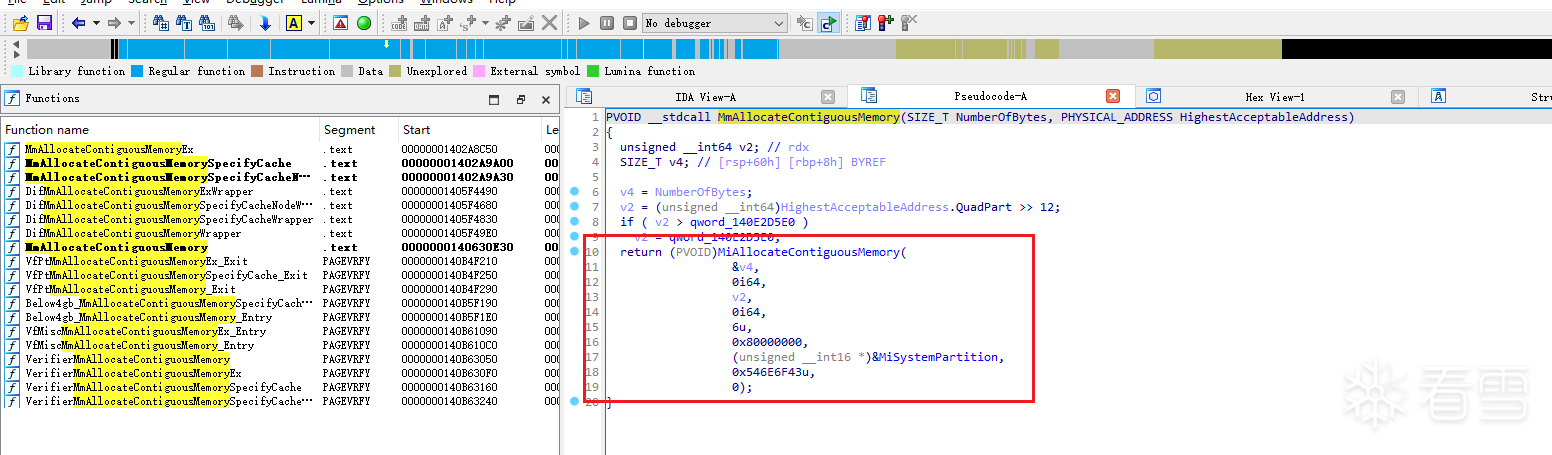 在检测这类 Shellcode 驱动时,一个很自然的切入点就是内核内存分配痕迹。因为无论是手动映射驱动,还是本文这种重映射后的匿名驱动,想要在内核中长期驻留,都必须先拿到一块新的可用内存。以本靶场中使用的 MmAllocateContiguousMemory 为例进行逆向分析。