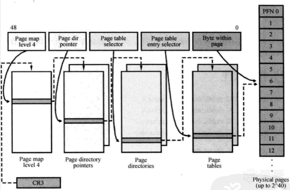 首先读取当前CPU的 CR3 寄存器,取得当前地址空间使用的顶级页表物理基址。随后通过 MmGetVirtualForPhysical 将 PML4 对应的物理页映射成内核虚拟地址,并从这里开始逐级遍历 PML4 -> PDPT -> PD -> PT 四级页表结构。
