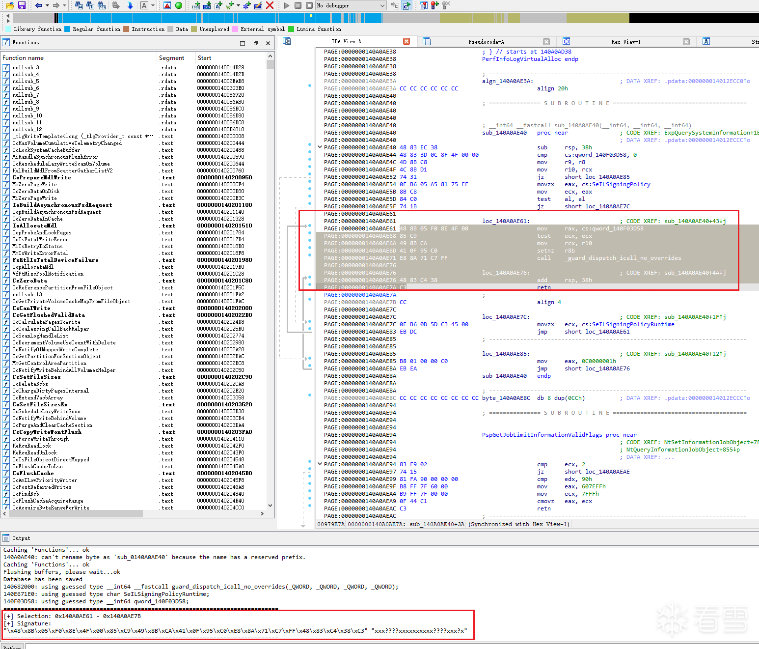 在前文中,笔者已经通过逆向分析确认了一条符合要求的 CFG 调用链。但在实际研究中,仅靠手工在 IDA 里逐层点交叉引用并不高效,尤其是在需要适配多个系统版本、反复验证目标点是否发生偏移时,更需要一种相对稳定、可重复的定位方法。出于这个目的,笔者选择使用 IDA 脚本辅助提取目标代码片段的上下文特征,再结合模式匹配的方式,在不同版本内核中快速确认该 CFG 点是否仍然存在,IDA脚本运行效果如图所示(IDA脚本完整代码已开源,Git仓库在文末 ):