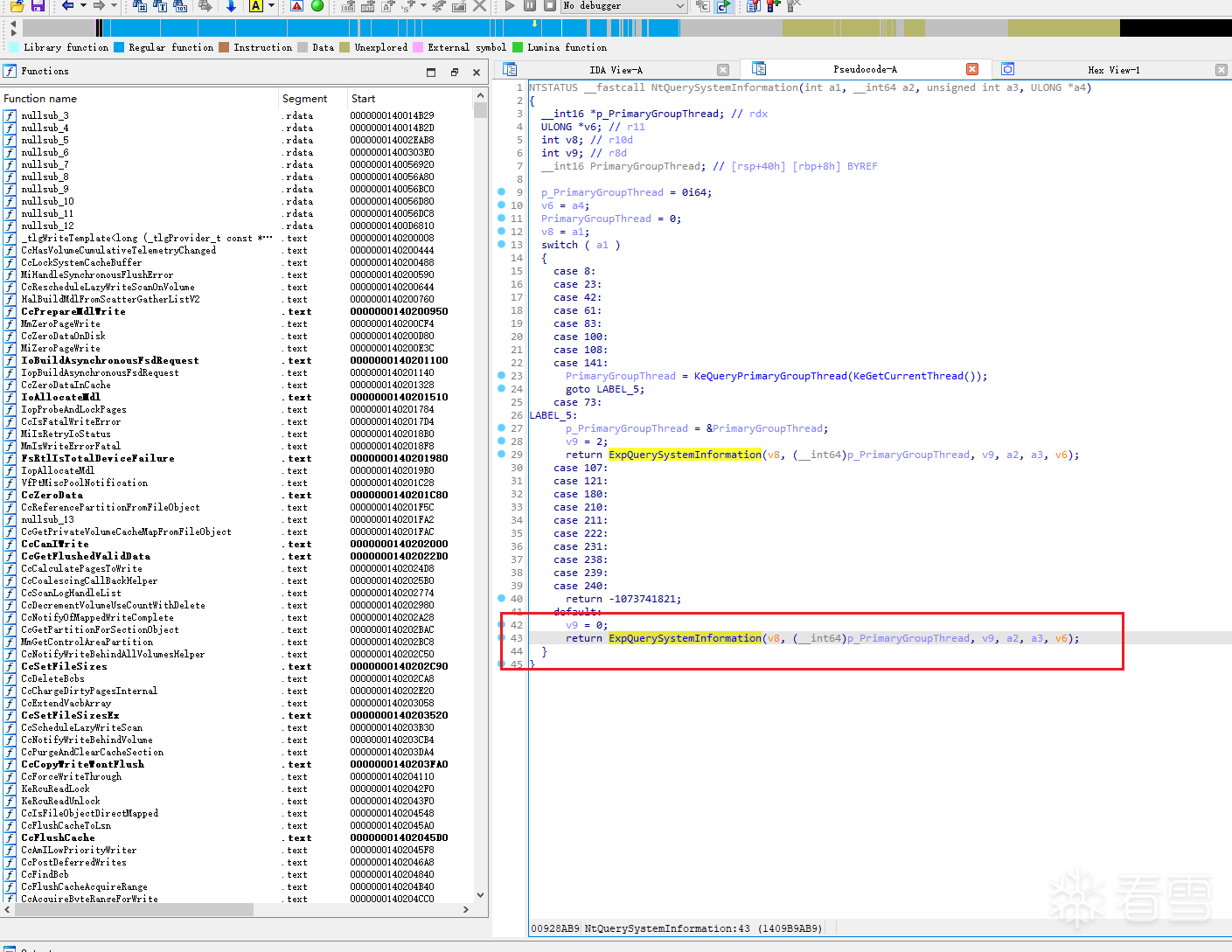 再继续向上追,就能回到最外层的系统调用入口 NtQuerySystemInformation,从反编译结果来看,103 这个分支并不属于那些需要特殊线程上下文处理的情况,因此它最终会走默认路径,如图2-4-3所示: