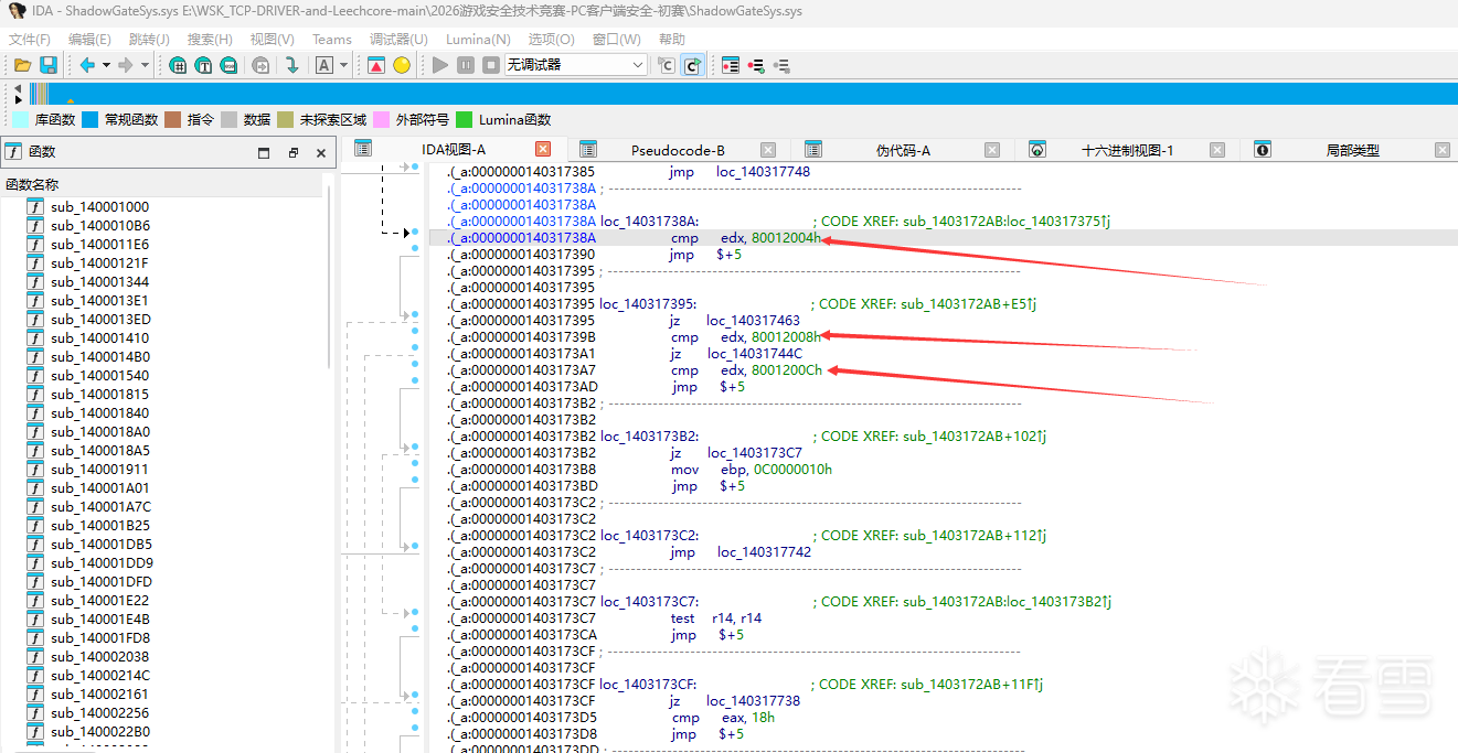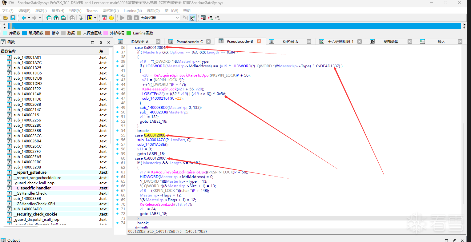 IrpDeviceControl 入口虽然跳到 VMProtect thunk,但 switch-case 框架还是看得到三个码: