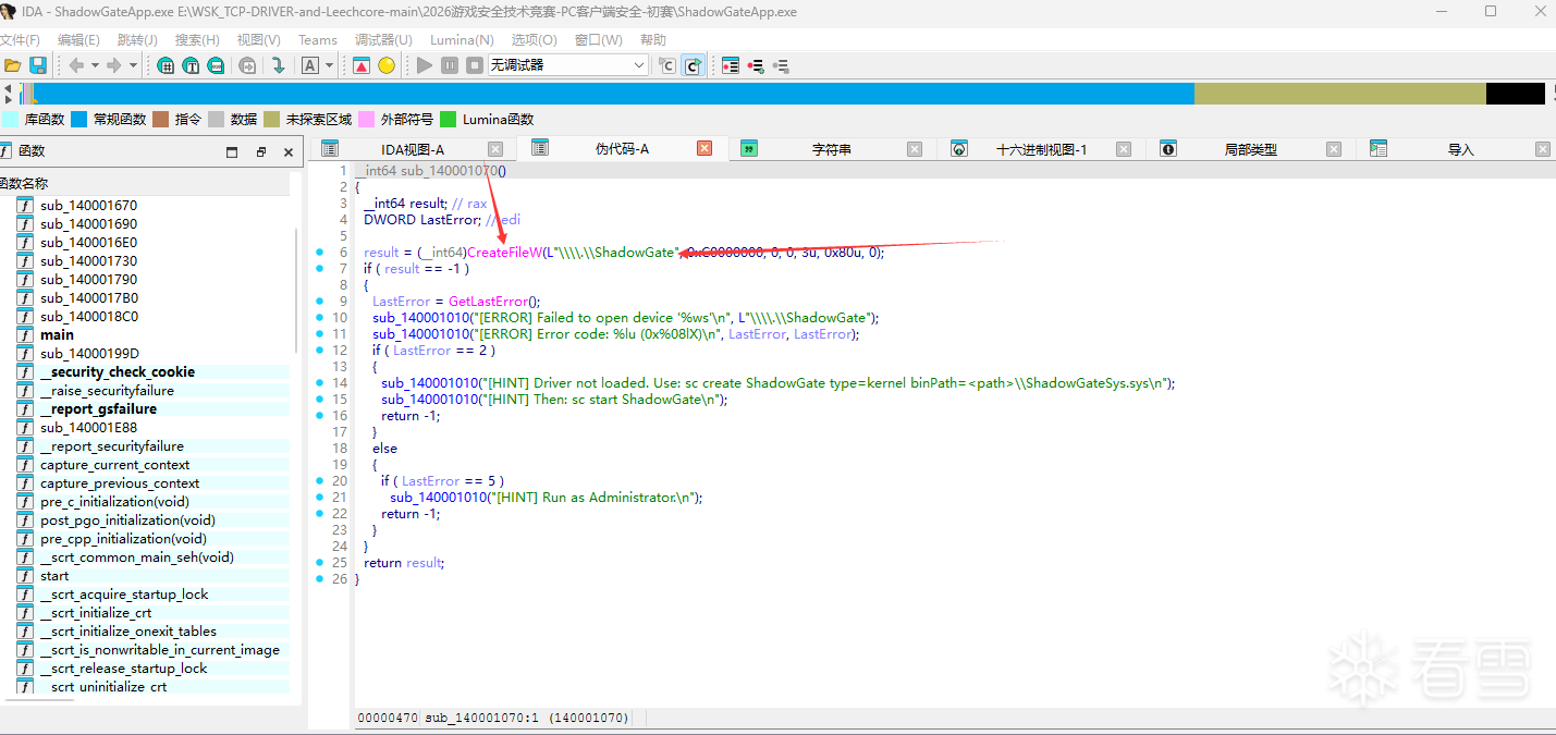 IDA 打开 EXE,先看它怎么连驱动的。在 main 附近很快找到 CreateFileW 调用: