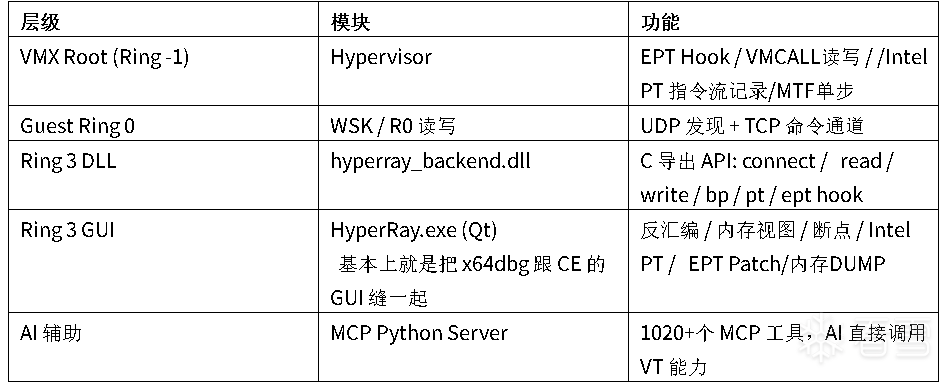 整套工具解耦设计,模块化开发。驱动通过 WSK 网络栈通信(以原生支持双机调试),GUI 通过 DLL 后端抽象层连接。MCP 层让 AI 可以直接调用 VT 调试器的全部能力 , 包括本次比赛中用到的内核内存读取。