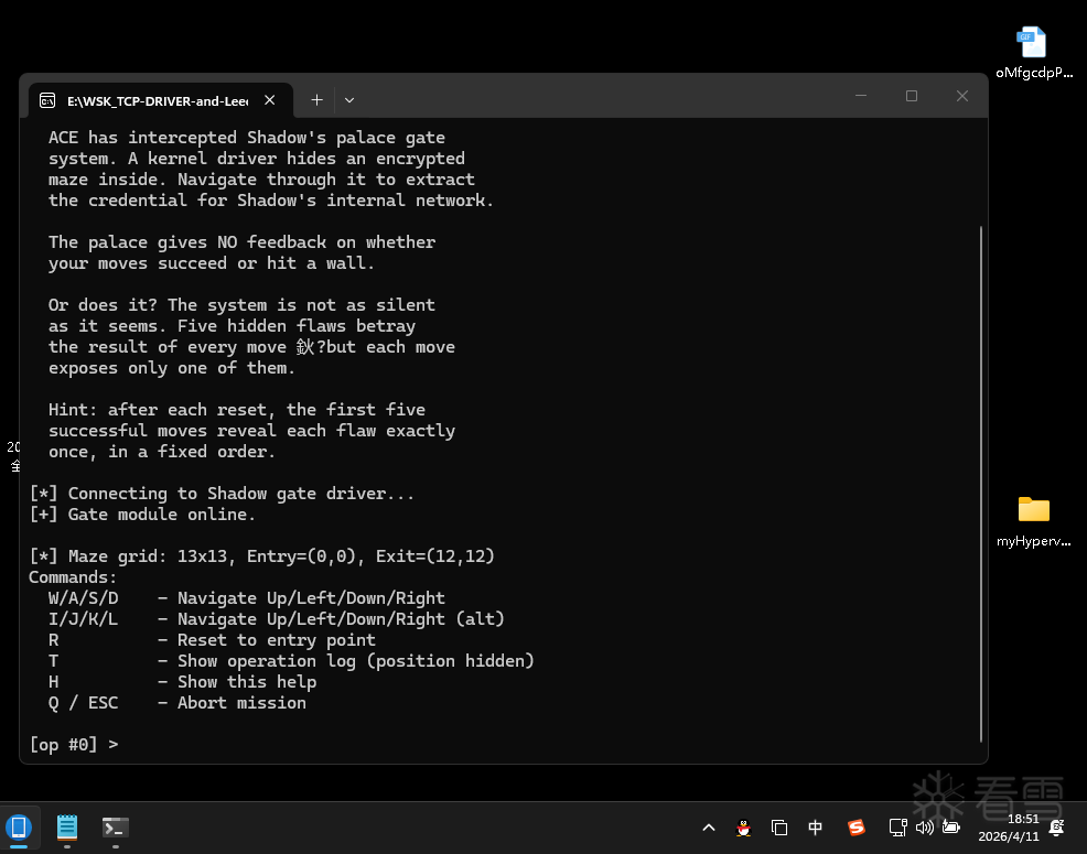 题目的核心设计:驱动核心逻辑被 VMP保护,选手只能看到接口和调用规则。在"黑盒"条件下,通过分析 5 条侧信道来摸清迷宫布局,最终提取 Flag。