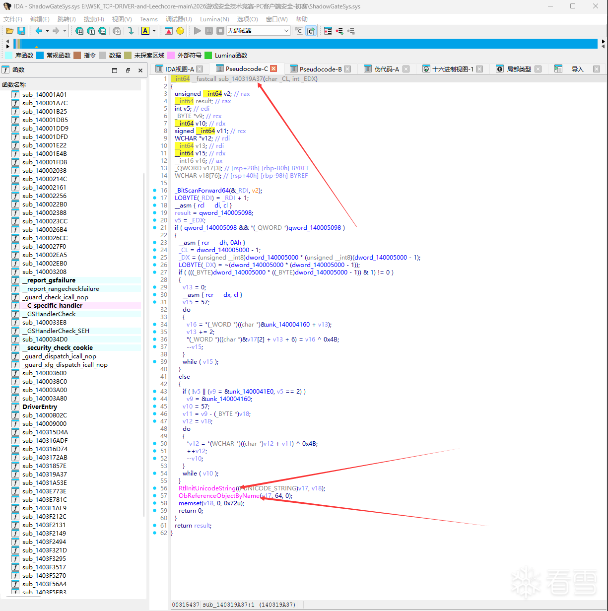 导入表一读完,心里就有数了:5 个侧信道对应 5 组可疑的 API 调用。接下来只需要对每个 API 做交叉引用(XREF),找到调用点,看看具体怎么用的。