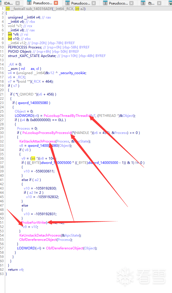 线索:PsLookup + KeStackAttachProcess + ProbeForWrite 三件套