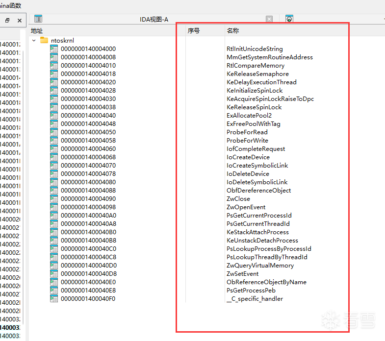 图 1-4: 导入表全貌 —— ntoskrnl 导入函数列表