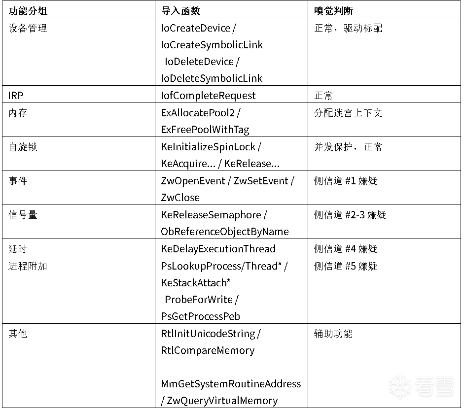 对于 VMP保护的驱动,大部分时候可以从导入表入手。IAT 必须保留明文函数指针,VMP 拿它没办法。翻一遍导入表,几乎所有侧信道的函数签名都暴露了: