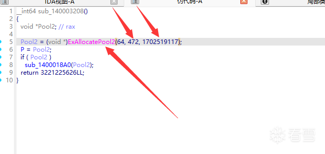 图 1-5: ExAllocatePool2(64, 472, 0x657A614D)