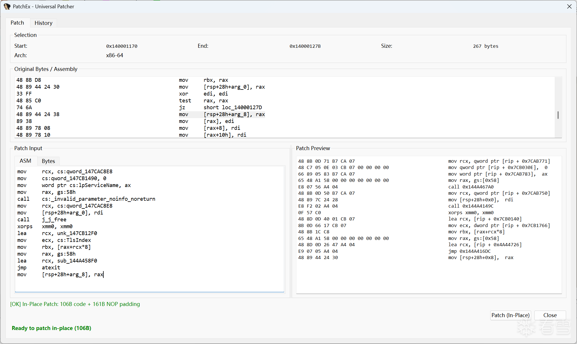 - 补丁预览:按“机器码字节 + 对应汇编”的形式逐行展示。