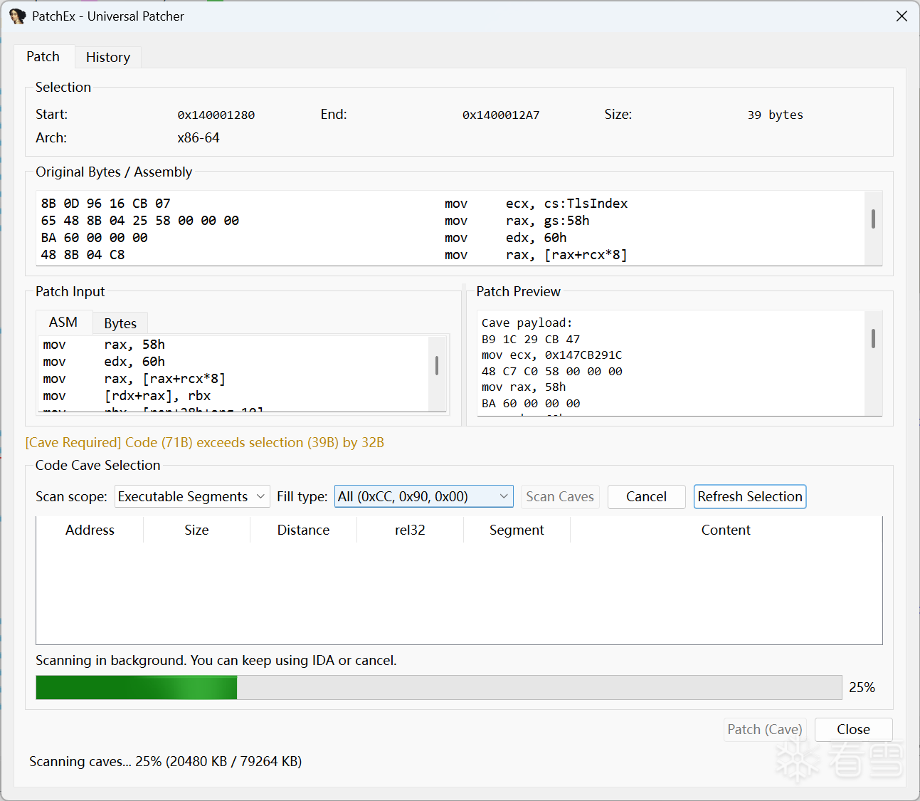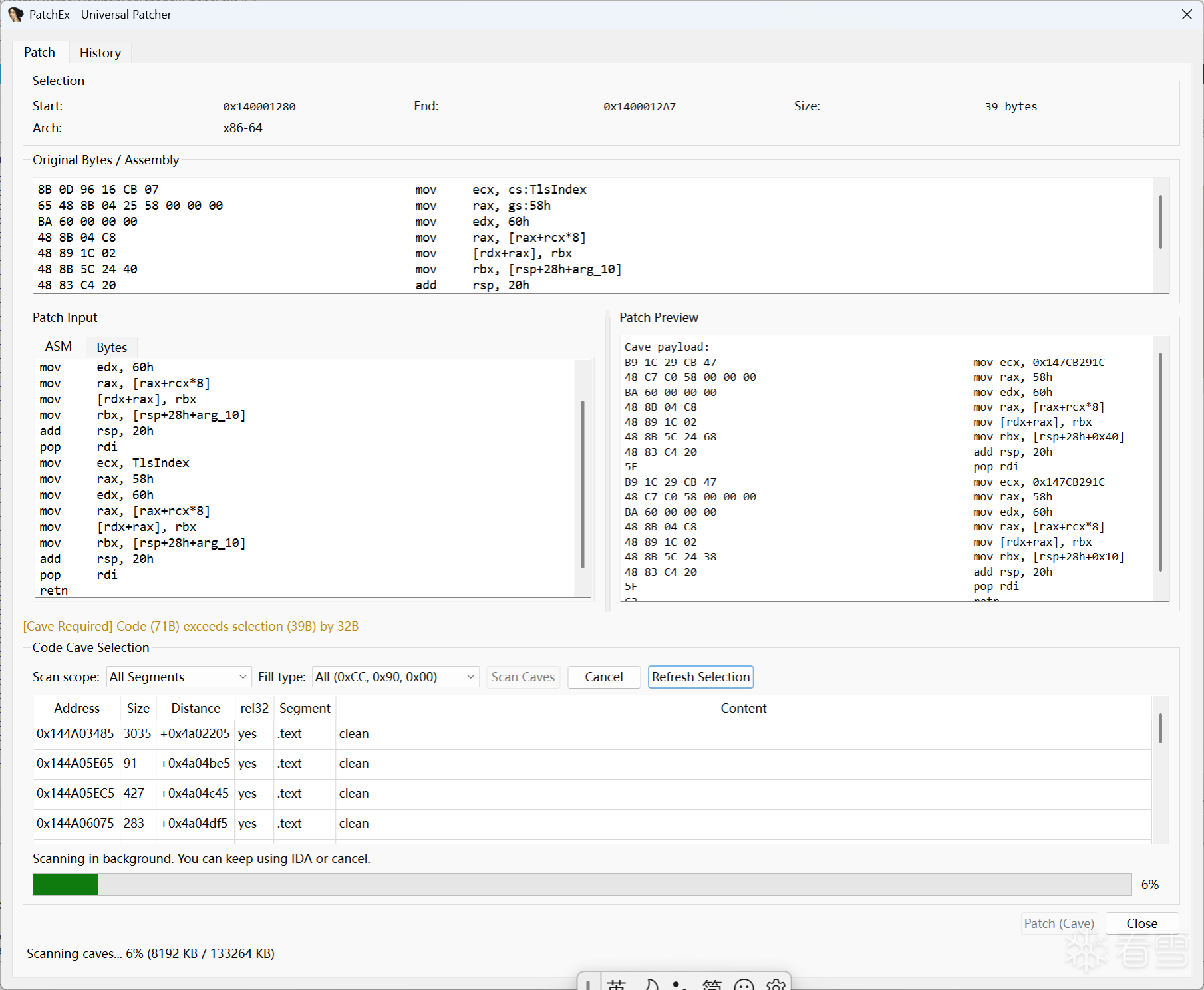 - 如果可以就地写入,直接 Patch;如果需要 cave,先扫描并选择 cave。