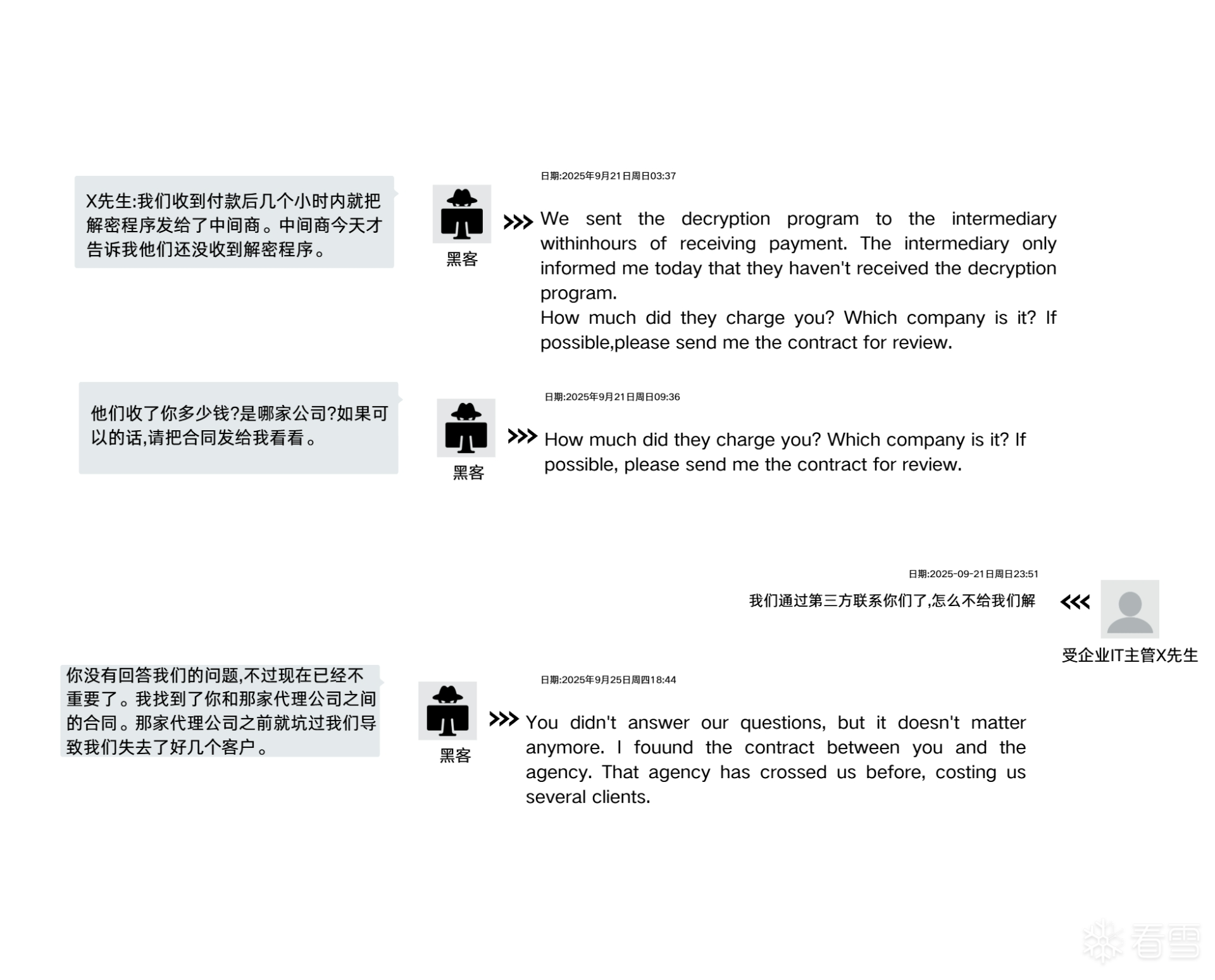 直到9月25日,黑客发出了最后通牒,戳穿了中介的老底:“我发现了你和代理公司的合同。那个代理公司之前坑过我们,害我们损失了好几个客户。”
