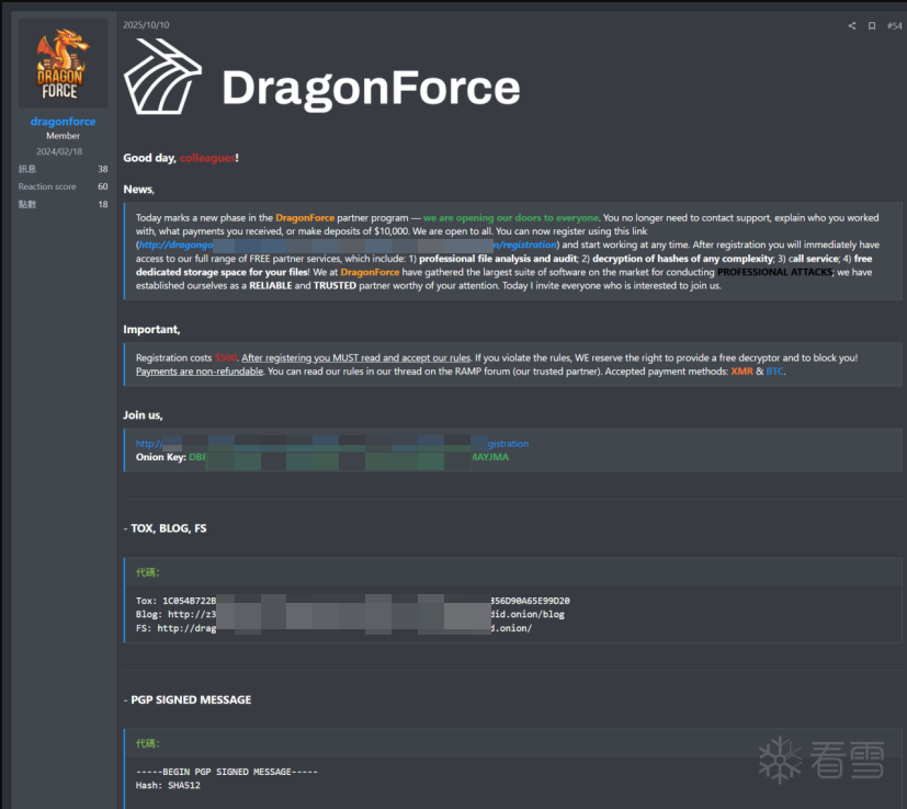 2025年第四季度,DragonForce激进地重塑了其招募规则,这一举措在暗网引起了广泛震动。传统的头部勒索组织通常设立数千美元的高昂押金和繁琐的人工审核流程,而DragonForce打破了这一行规。情报显示,该组织将加盟费直接降至500美元,这一价格仅为行业平均水平的10%左右,极大地降低了网络犯罪的经济门槛。