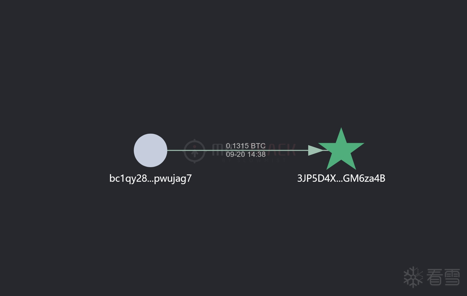 根据受害者描述,当时付款给中介公司(30万元人民币),而后我们通过链上追踪中介公司的转账记录,他们在9月20日向黑客地址转账了约 0.1315BTC(10万元人民币含手续费、资金波动等)。我们锁定了两个关键地址: