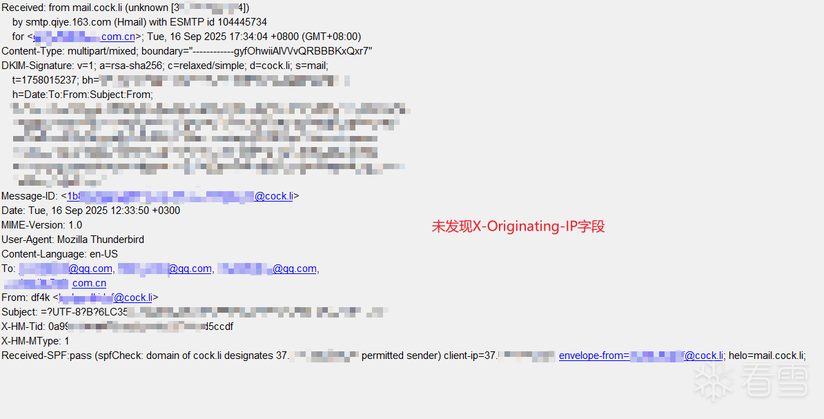 x-originating-ip相关字段,因为cock.li 是一个注重隐私的邮件服务商,它在邮件头中隐藏了原始发件人的真实IP地址(没有 X-Originating-IP 这样的字段)。