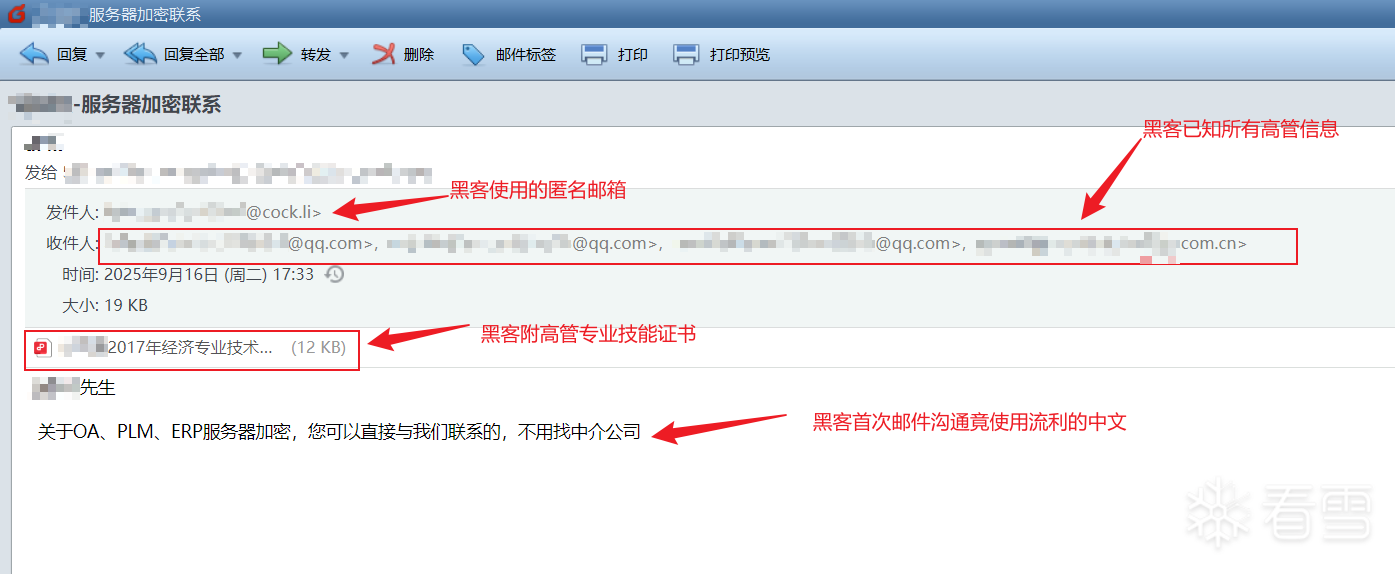 时间点:2025年9月16日 17:34 黑客首次向受害者发送勒索邮件。值得注意的是,邮件正文使用的是中文,且附件中包含了一个受害企业中IT主管“X先生”的个人专业技能证书。