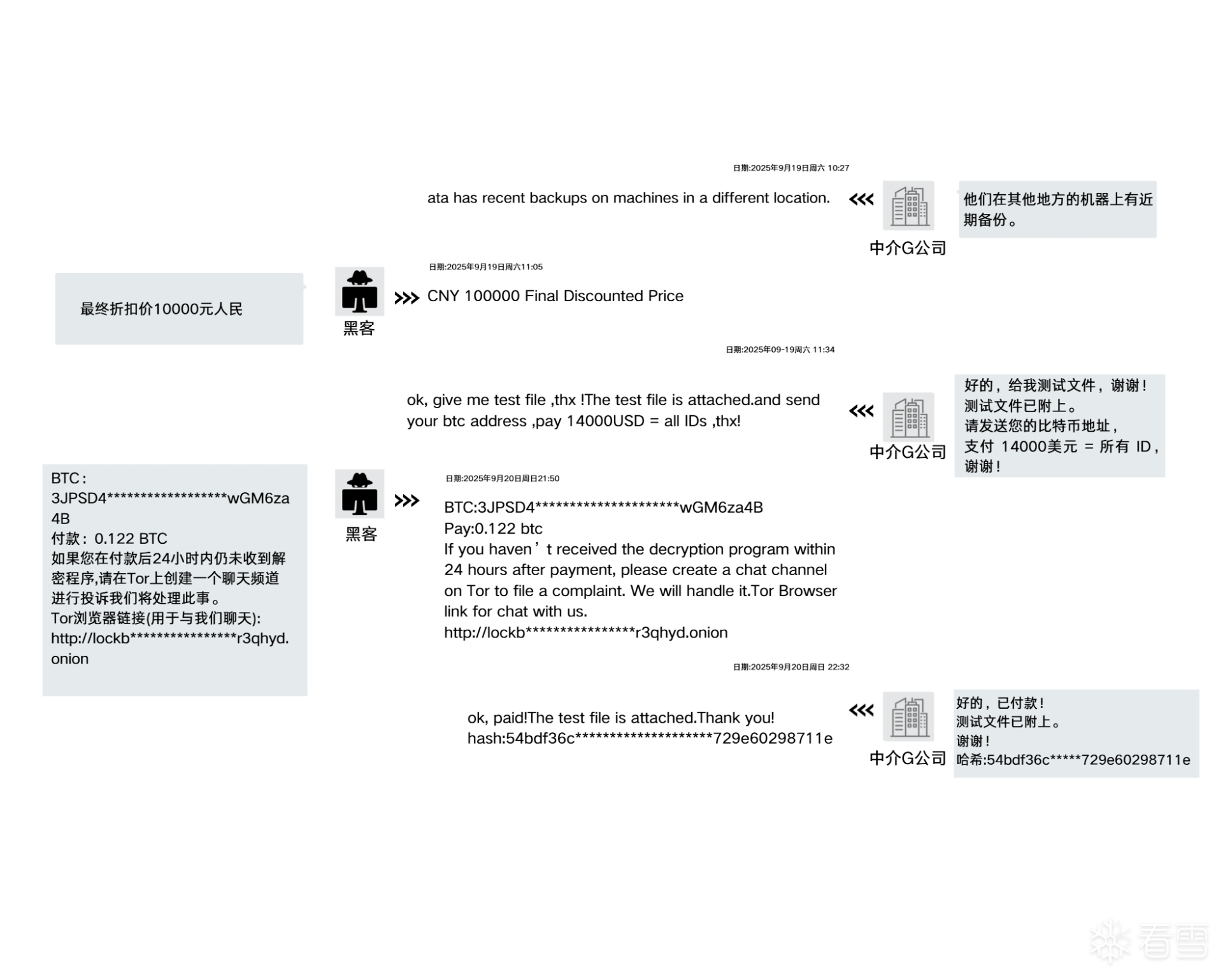 时间点:2025年9月22日 09:12 受害者因急于恢复业务,告知黑客“已委托第三方公司联系”。这种表述直接暴露了客户“病急乱投医”的心理,让黑客意识到这是一只待宰的肥羊。