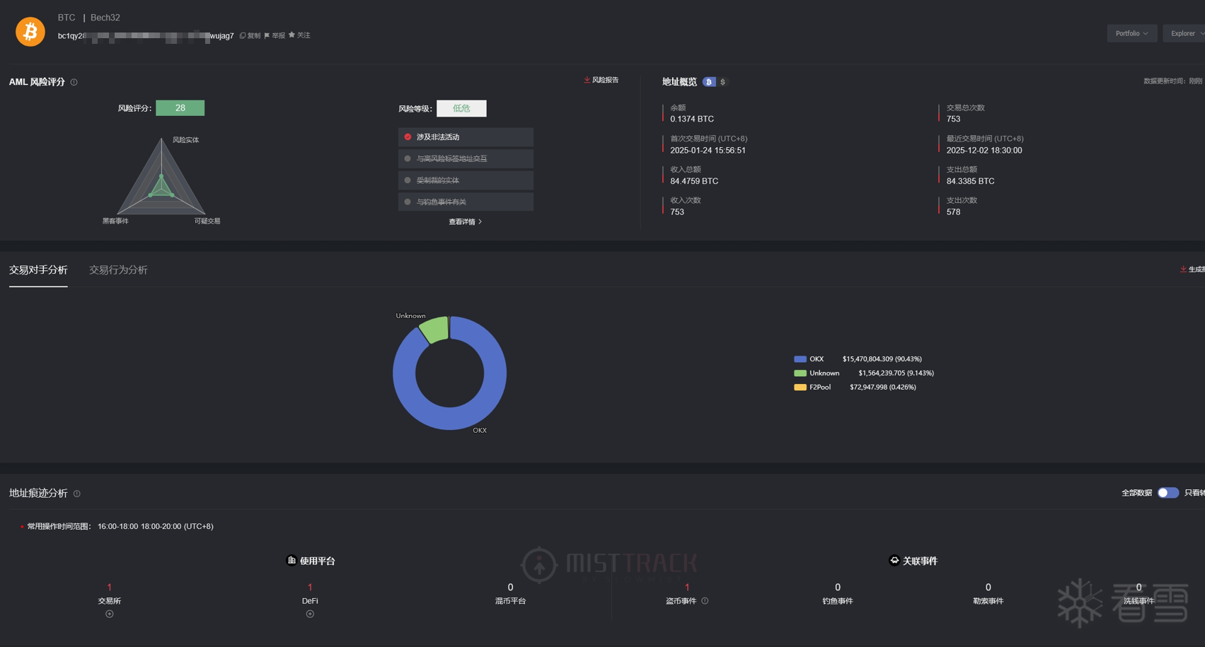 既然中介声称“已付款”,钱到底去哪了?Solar团队利用 MistTrack(慢雾) dashboard.misttrack.io等链上追踪平台,对涉案的比特币地址进行了深度穿透分析,结果令人咋舌。