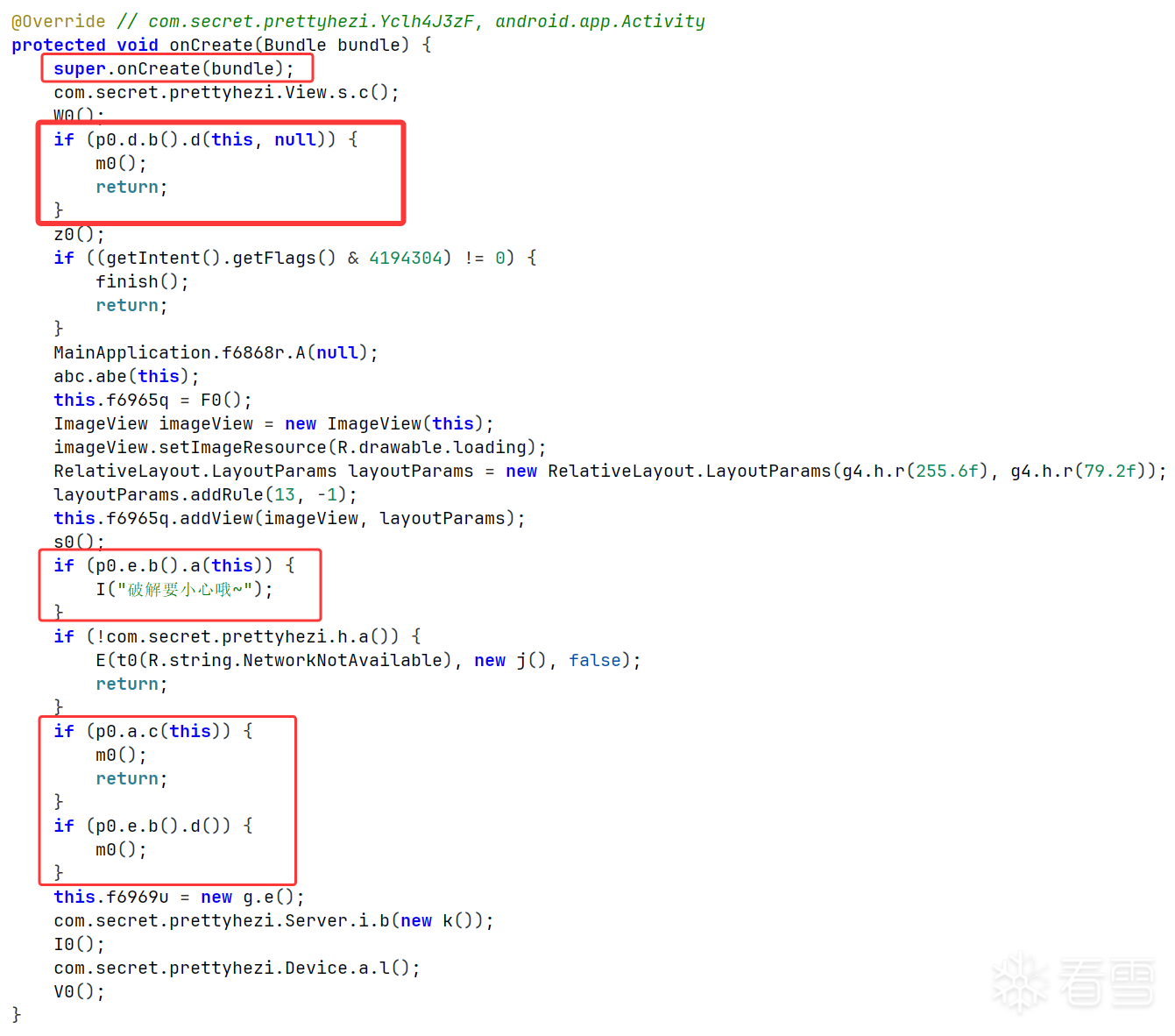 com.secret.prettyhezi.OuiCrGxF,Application为com.secret.prettyhezi.MainApplication。 - 启动链同时存在 Root、模拟器、Xposed 等多条会直接触发